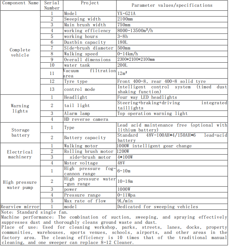 Место на употреба: Користено за чистење работилница, паркови, улици, ленти, пристаништа, сопственост Комуникации, магацини, спортски места, училишта, аеродроми и други области во областа на факторите. Ефикасноста за чистење е 10 пати поголема од традиционалното прирачно расчистување, а еден чистач може да замени чистач од 8-12