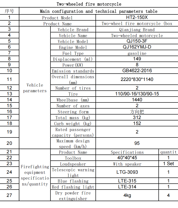 Огнениот моторцикл за пожарникари има одлични перформанси надвор од патот. Може брзо и флексибилно да изврши противпожарна заштита и спасување на груби планински патишта или тесни улици. Во случај на ненадејна опасност од пожар, може да носи 3 лица да формираат борбен тим за да го изгаснат изворот на пожар.